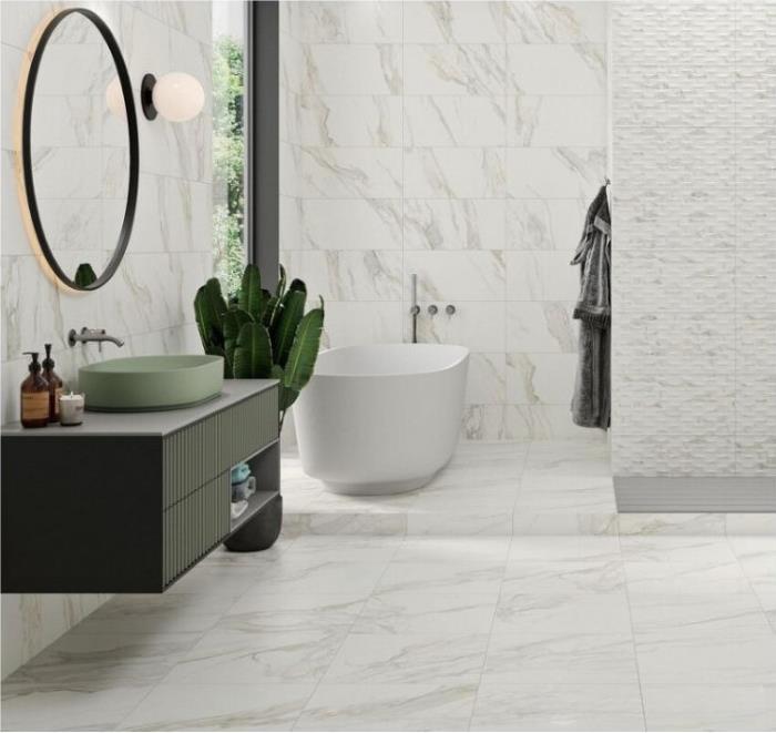 Pločice koje imitiraju prirodni beli mermer dizajnirane tako da vizuelno podsećaju na izgled belog mermera. Ove pločice pružaju elegantan i luksuzan izgled prostoru, ali su lakše za održavanje jer ne zahtevaju posebne tretmane poput redovnog poliranja.