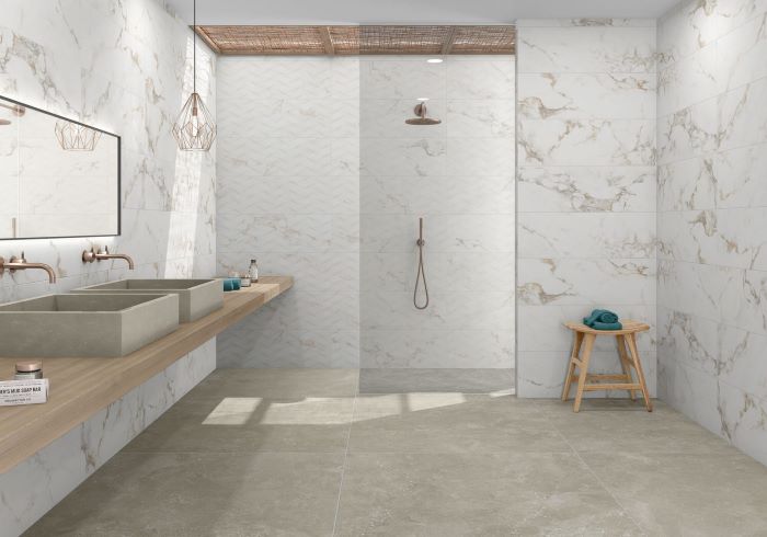 Pločice koje imitiraju prirodni beli mermer dizajnirane tako da vizuelno podsećaju na izgled belog mermera. Ove pločice pružaju elegantan i luksuzan izgled prostoru, ali su lakše za održavanje jer ne zahtevaju posebne tretmane poput redovnog poliranja.