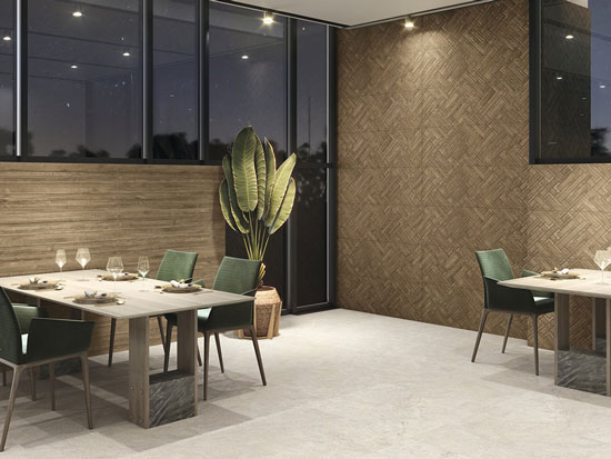 LAOS šara na pločicama simulira izgled drvenih letvica postavljenih jedna pored druge, stvarajući efekat drvenog poda.
